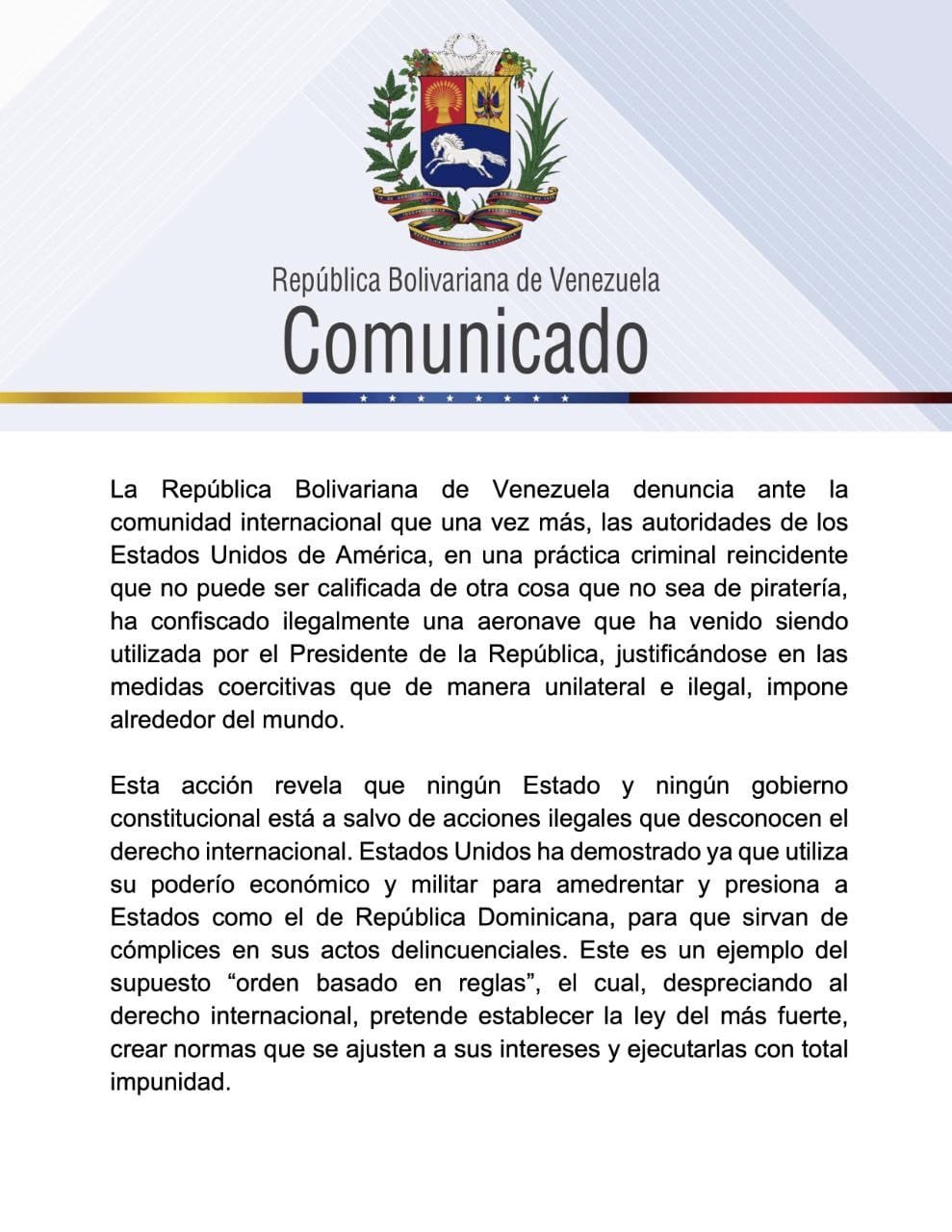 Gobierno de Venezuela califica como un acto de «piratería» confiscación de avión presidencial