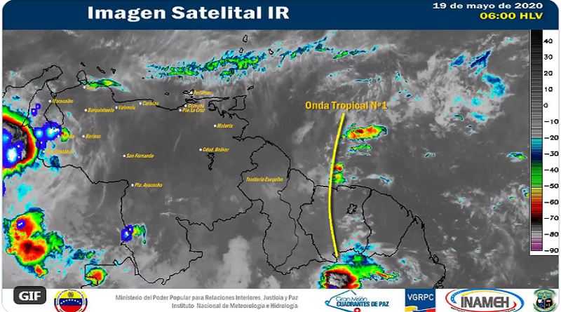 El Instituto Nacional de Meteorología e Hidrología (Inameh) prevé en horas de la tarde y noche, sobre el oriente del país, la llegada de la primera Onda Tropical de la temporada, anunció el presidente del organismo, José Pereira, en un contacto telefónico con Venezolana de Televisión. En la cuenta de la red social Twitter @INAMEH se informa que la Zona de Convergencia Intertropical (ZCI), moderadamente activa al Sur, genera abundante nubosidad y precipitaciones de variada intensidad con eventuales descargas eléctricas en áreas del Zulia, los Andes, Llanos Occidentales, Amazonas, Sur de Bolívar y el Esequibo.