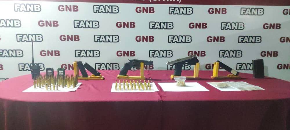 Agregó el jefe militar, que en el sitio fue incautada una pistola Glock, calibre 9 mm. con serial devastado, un revólver calibre 38mm, con 4 cartuchos, 30 municiones calibre 7,62×59, cartuchos calibre 9 mm, 3 cargadores de pistola, un cargador de Fal, 20 gramos de presunta Marihuana, 150 gramos de material aurífero (oro) y un radio portátil con dos baterías.