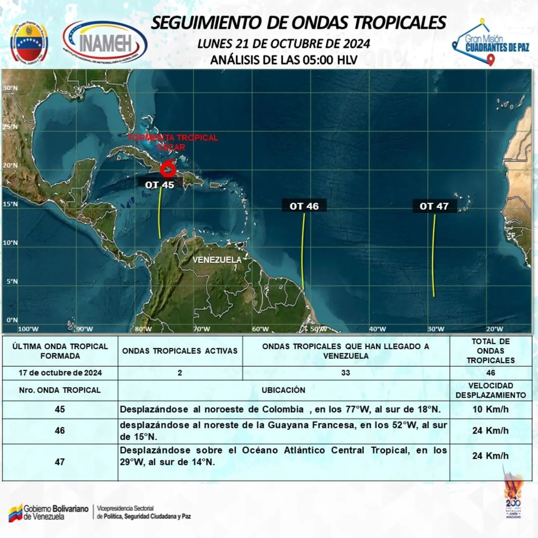 Onda Tropical N°47: Desplazándose en el océano Atlántico Central Tropical. Se estima su entrada al país el próximo miércoles 23 de octubre.