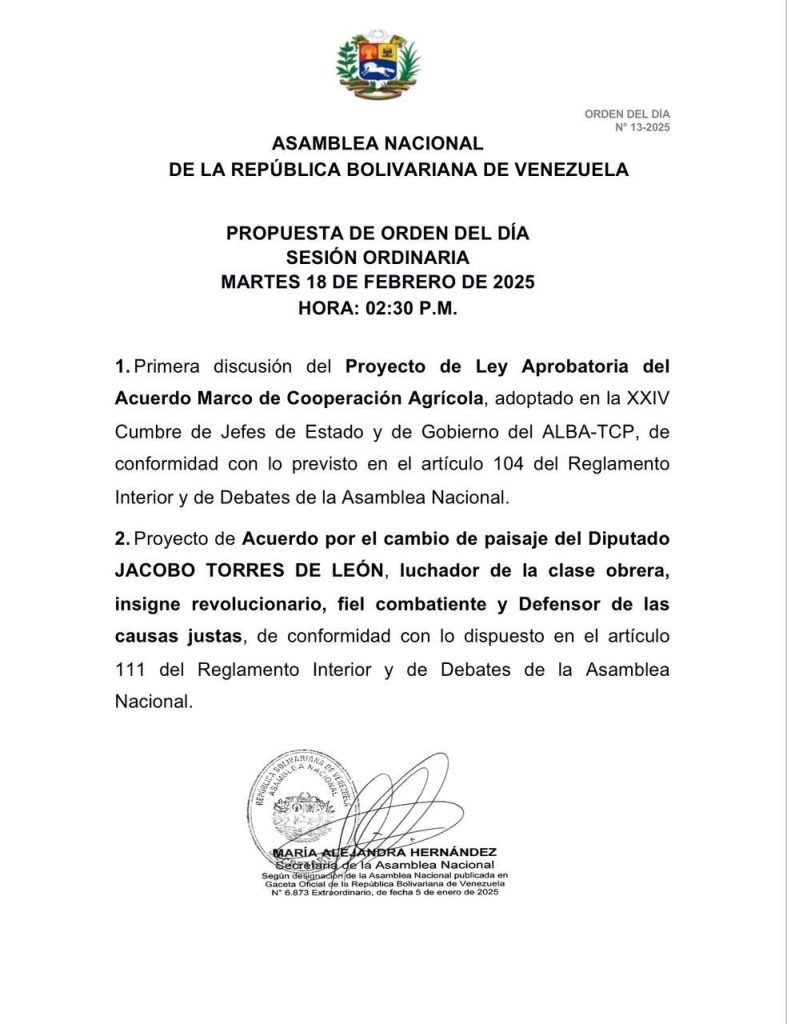 Este martes 18 de febrero la Asamblea Nacional tiene previsto realizar su acostumbrada sesión, donde debatirán en primera discusión el «Proyecto de Ley Aprobatoria del Marco de Cooperación Agrícola», tal y como se estableció en la XXIV Cumbre de jefes de Estado y de Gobiernos del Alba-TCP.