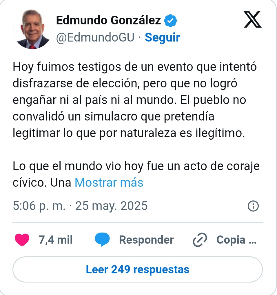 El líder opositor, Edmundo González, desestimó el evento electoral convocado por el Consejo Nacional Electoral para este domingo 25 de mayo y aseguró que el «pueblo no convalidó» la acción.