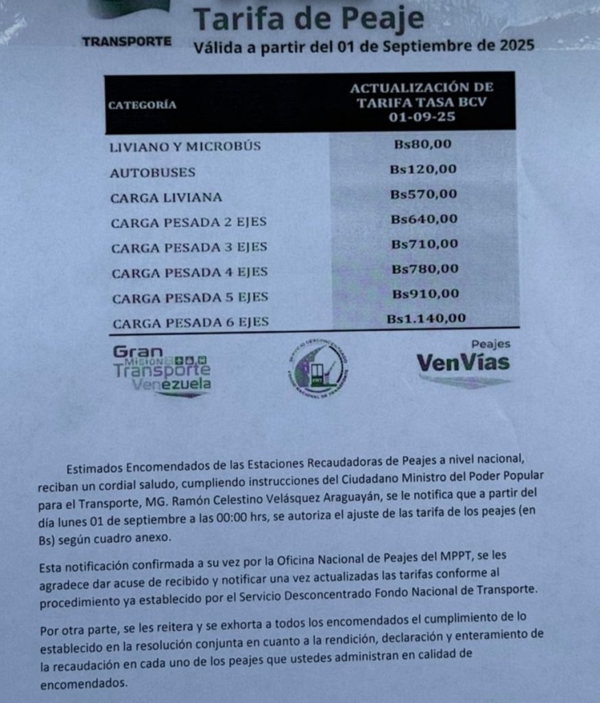El Ministerio del Poder Popular para el Transporte, informa a la ciudadanía sobre la entrada en vigencia de las nuevas tarifas de peajes en todo el territorio nacional a partir de este 1 de septiembre. Este ajuste, que representa el tercer aumento del año, busca garantizar el mantenimiento y operatividad de las vías y autopistas del país.