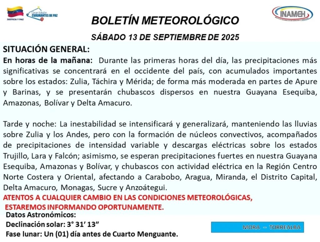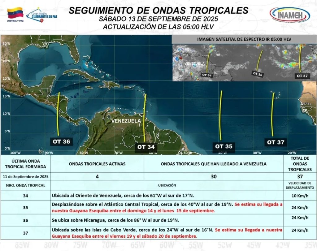 El Instituto Nacional de Meteorología e Hidrología (Inameh) informó este sábado 13 de septiembre, que la onda tropical número 34 se desplaza por el Oriente de Venezuela y se desplaza a una velocidad de 10 kilómetros por hora. Además de los efectos de esta onda, se espera la llegada de otras dos en los próximos días.