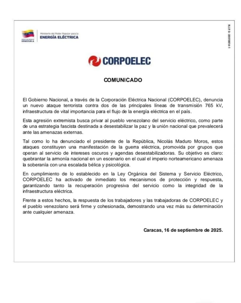 El pasado miércoles, la empresa denunció un ataque contra dos líneas de transmisión de 230 kV, lo que calificó también como un «sabotaje» que, dijo, se produjo en medio de una «sistemática agresión» por parte de Estados Unidos, que mantiene un despliegue militar en el mar Caribe cerca de Venezuela.