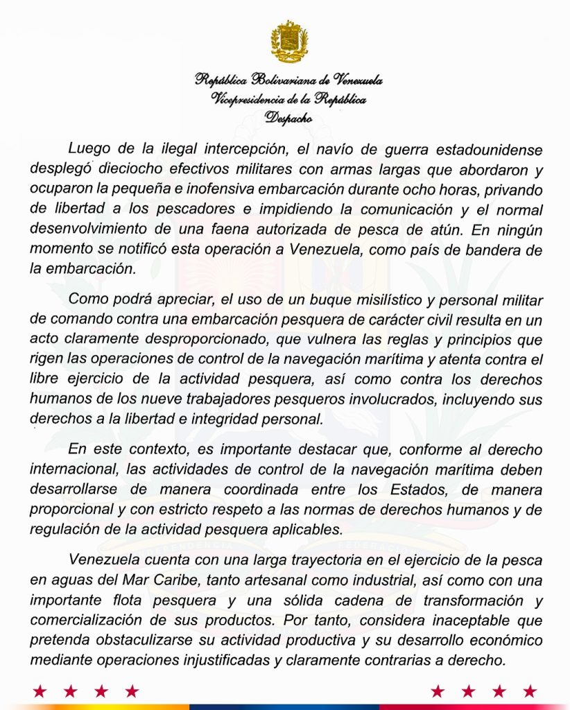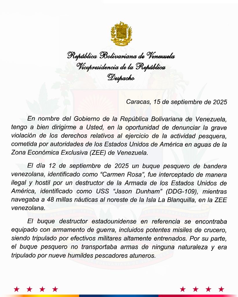 “Denunciamos y dejamos constancia de la grave violación a la soberanía nacional por parte del Gobierno de los Estados Unidos (EE. UU.), cuando el pasado 12 de septiembre un buque destructor de la armada estadounidense interceptó de forma ilegal al pesquero venezolano ‘Carmen Rosa’ en nuestra Zona Económica Exclusiva”, recordó Rodríguez a través de un mensaje publicado en su canal de Telegram.