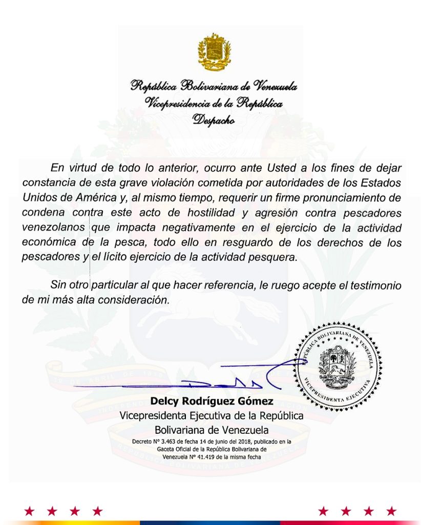 Venezuela envió comunicaciones a siete organismos internacionales relacionados con la pesca comercial, incluida la Organización de las Naciones Unidas para la Alimentación y la Agricultura (FAO), luego de la agresión del Ejército estadounidense contra pescadores en el Caribe; así lo dio a conocer la vicepresidenta Ejecutiva de la República, Delcy Rodríguez.