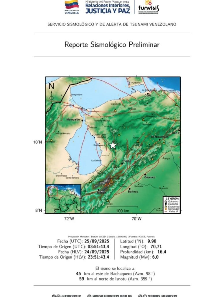 La Fundación Venezolana de Investigaciones Sismológicas (Funvisis) informó que el movimiento telúrico tuvo lugar a las 11:51 de la noche, 45 kilómetros al este de Bachaquero y con una profundidad de 16.4 kilómetros.
