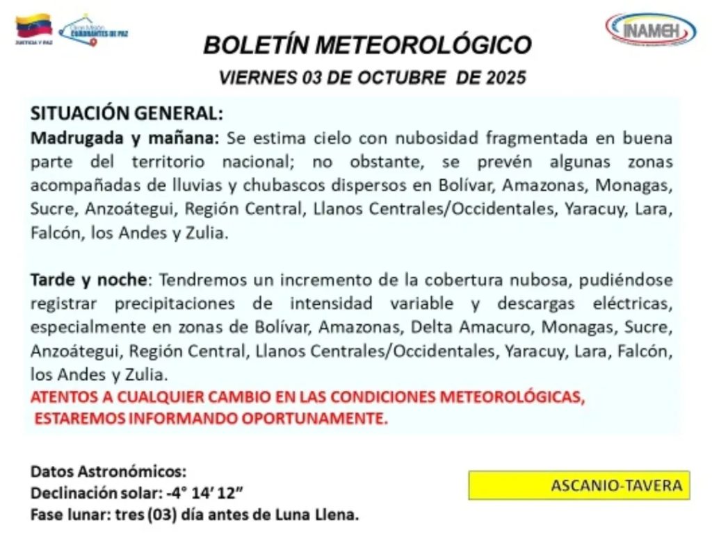 Para después del mediodía se advierte que habrá un aumento progresivo de la cobertura nubosa asociada a precipitaciones de intensidad variable junto a posibles descargas eléctricas, que se registrarán en áreas de Zulia, los Andes, Falcón, Lara, Yaracuy, Llanos Centrales y Occidentales; Región Central, Anzoátegui, Sucre, Monagas, Delta Amacuro, Amazonas y Bolívar.