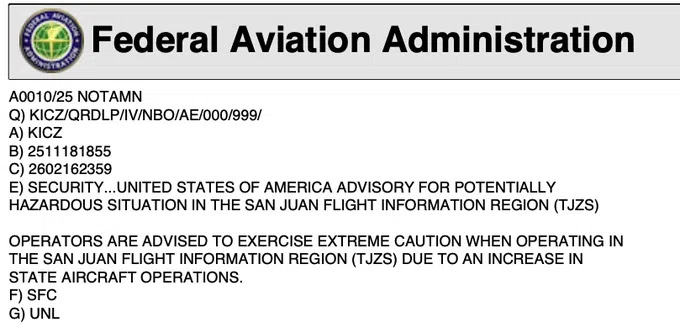Estados Unidos ha formalizado una advertencia de riesgo potencial para el tráfico aéreo civil al emitir la Notam (Notice to Airmen) A0010/25. Este aviso está enfocado en el FIR (Región de Información de Vuelo) de San Juan, que cubre gran parte del espacio aéreo del Caribe adyacente a Puerto Rico.