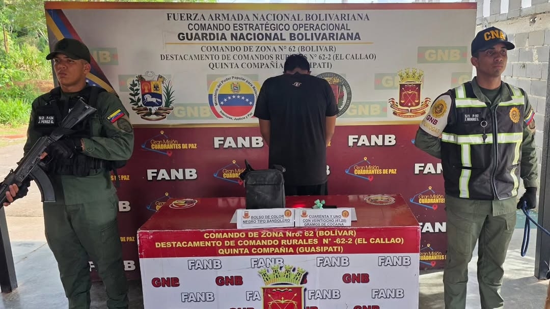 Efectivos militares de la Fuerza Armada Nacional Bolivariana (FANB), adscritos al Comando de Zona de la Guardia Nacional Bolivariana N° 62 (CZGNB-62) del estado Bolívar, en una acción coordinada con la Unidad Regional de Inteligencia Antidrogas N° 62 (URIA-62), lograron la aprehensión de un ciudadano y la incautación de sustancias ilícitas.