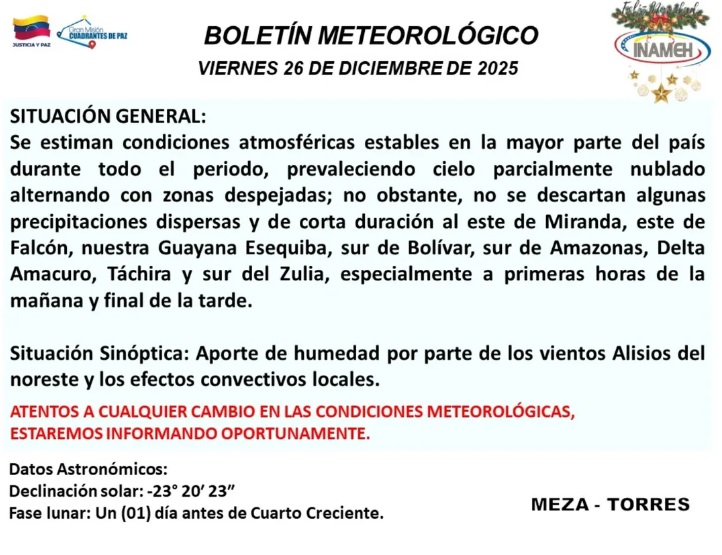 Se estiman condiciones atmosféricas estables en la mayor parte del país durante todo el periodo, al prevalecer cielo parcialmente nublado alternando con zonas despejadas, informó el boletín de las autoridades del Instituto Nacional de Meteorología e Hidrología (Inameh).