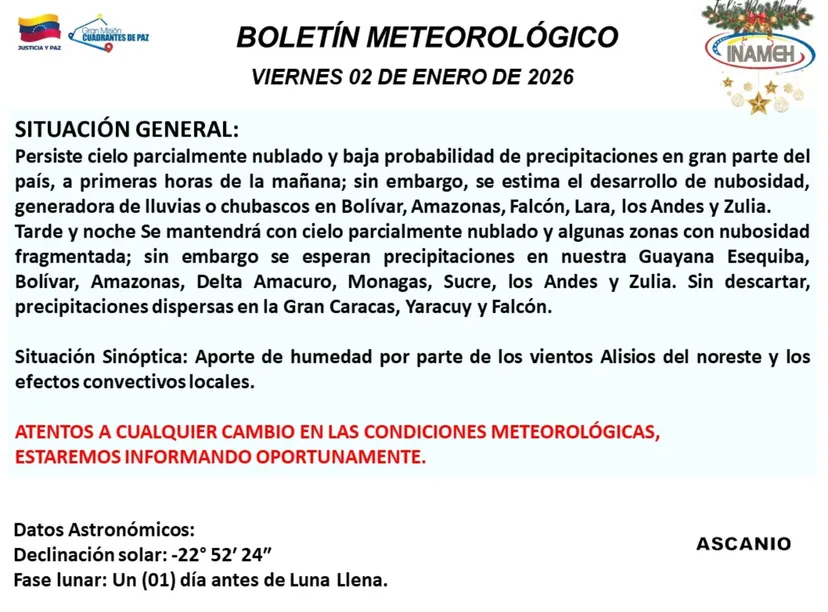 El reporte meteorológico publicado en el canal de Telegram del Instituto Nacional de Meteorología e Hidrología (Inameh) prevé para este viernes cielo parcialmente nublado y baja probabilidad de precipitaciones en gran parte del país durante la mañana.
