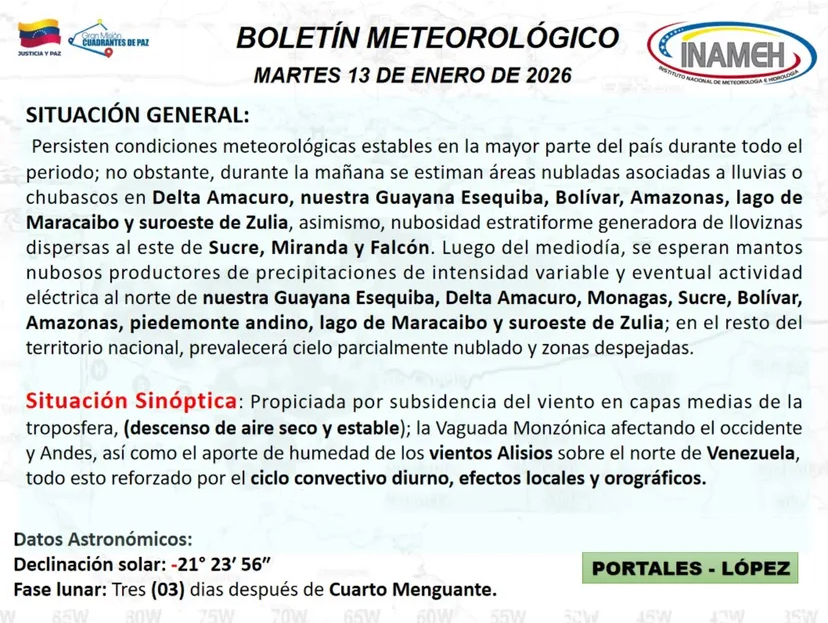 El Instituto Nacional de Meteorología e Hidrología (Inameh), prevé para este martes 13 de enero, mantos nubosos con posibles lluvias o lloviznas en algunas zonas del país.
