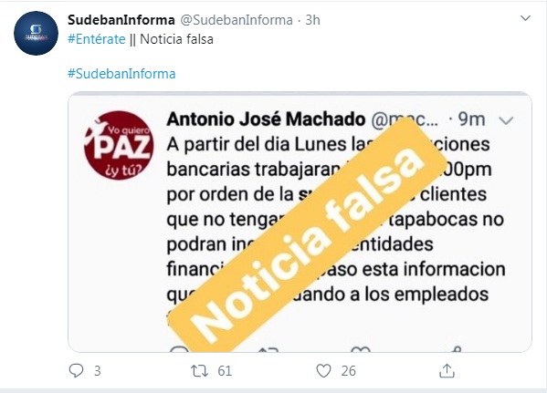 A través de su cuenta oficial en Twitter la Superintendencia de las Instituciones Bancarias (Sudeban) desmintió supuesto comunicado en el cual la institución estimaba pertinentes una serie de recomendaciones ante la llegada del Coronavirus a Venezuela.