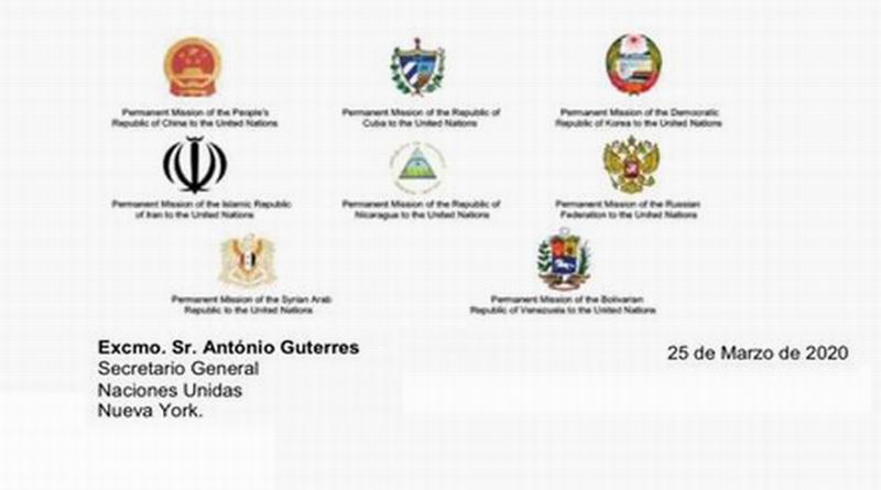 China, Rusia, Irán, Siria, Corea, Cuba, Nicaragua y Venezuela solicitaron formalmente al secretario general de Naciones Unidas (ONU), António Guterres, sumarse con fuerza a la exigencia del cese de medidas coercitivas ilegales y unilaterales contra los pueblos y gobiernos, en esta crisis global de la pandemia del coronavirus.