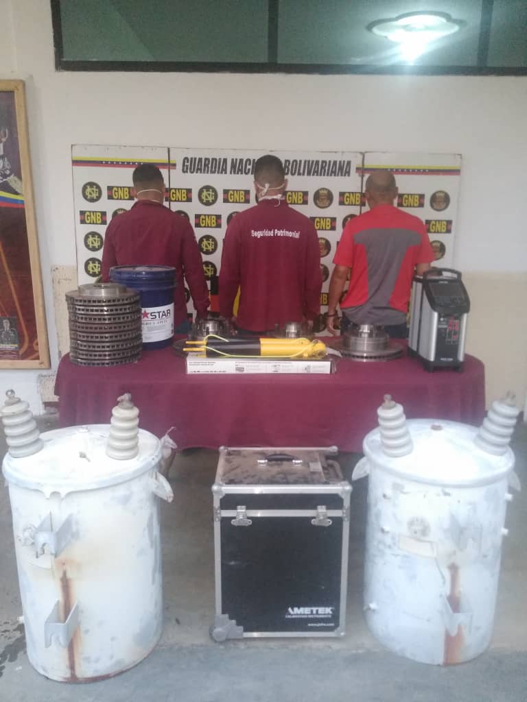 El G/B Rodríguez Cepeda destacó que los detenidos transportaban 02 transformadores de electricidad, 11 discos de frenos de vehículos04 amortiguadores, 01 paila de aceite y 01 equipo de detección de falla marca Ametex, materiales propiedad de la referida empresa.