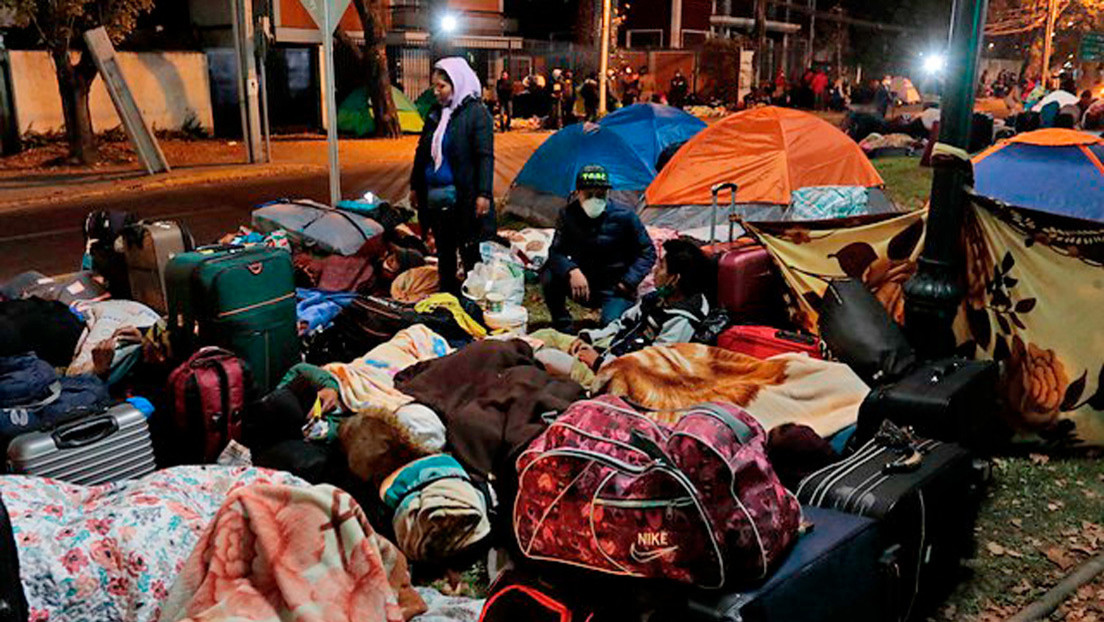 Un grupo de unos 400 bolivianos acampan desde hace tres días a las afueras del Consulado de Bolivia en Santiago, capital de Chile, a la espera de que se apruebe un «traslado humanitario» para regresar a su país.