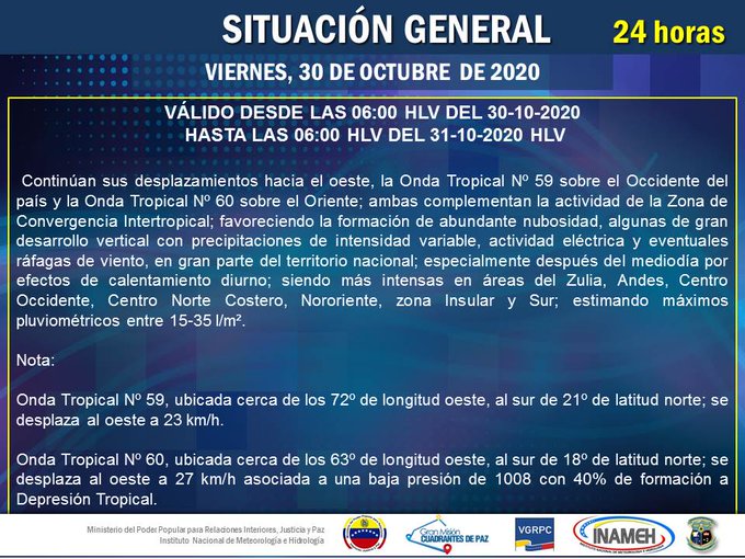 “Continúan sus desplazamientos hacia el oeste, la Onda Tropical Nº 59 sobre el Occidente del país y la Onda Tropical Nº 60 sobre el Oriente; ambas complementan la actividad de la Zona de Convergencia Intertropical; favoreciendo la formación de abundante nubosidad, algunas de gran desarrollo vertical con precipitaciones de intensidad variable, actividad eléctrica y eventuales ráfagas de viento, en gran parte del territorio nacional”, escribió el ente.