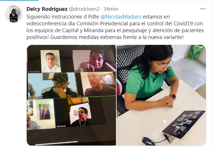 “Siguiendo instrucciones del presidente Nicolás Maduro estamos en videoconferencia de la Comisión Presidencial para el Control de la COVID-19 con los equipos de Distrito Capital y Miranda para el pesquisaje y atención de pacientes positivos. Guardemos medidas extremas frente a la nueva variante!”, informó la vicepresidenta ejecutiva, Delcy Rodríguez, a través de cuenta oficial en la red social Twitter @drodriven2.