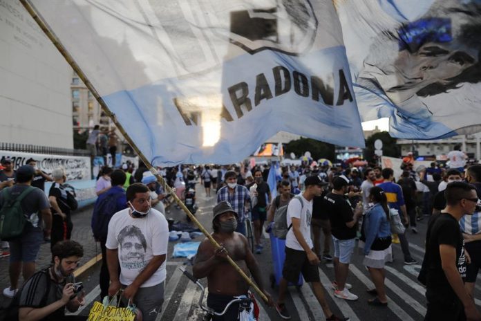 El mítico Obelisco porteño, donde los argentinos celebraron en 1986 la obtención de la Copa del Mundo de México gracias a Diego Maradona, volvió a convertirse en el punto de encuentro de cientos de fanáticos del astro del fútbol que bramaron una consiga clara: “No se murió, lo mataron”.