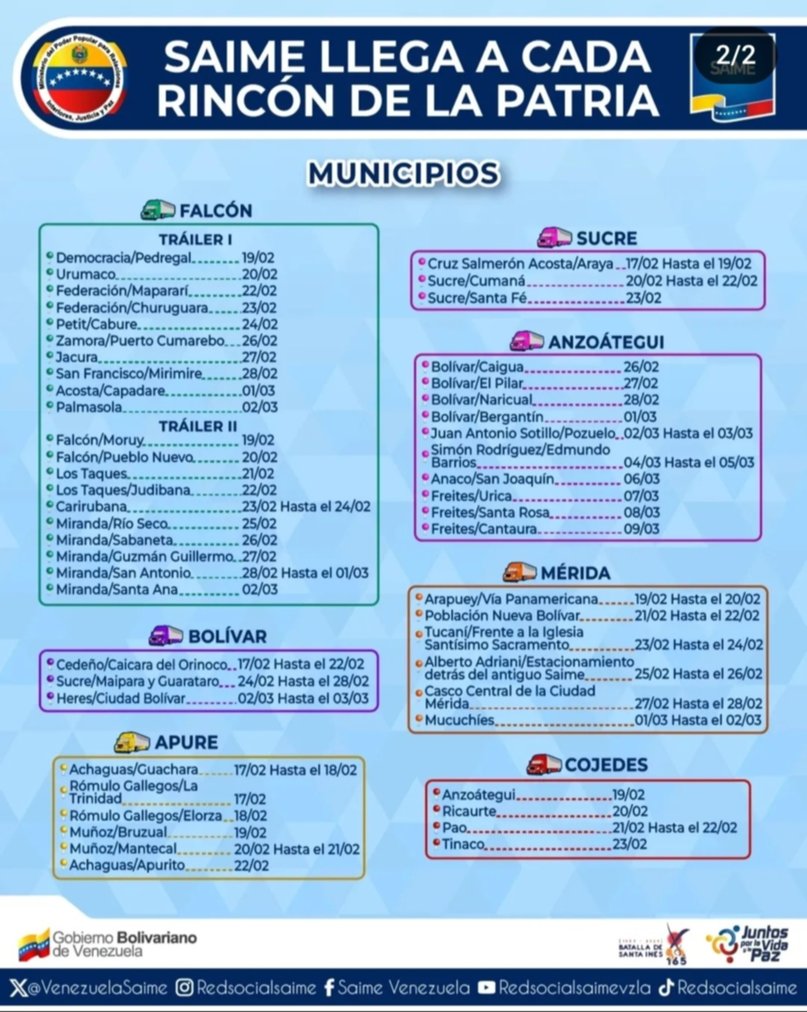 De acuerdo con lo publicado por el Saime estas Oficinas móviles se ubicarán en puntos específicos de cada municipio, para que la ciudadanía venezolana pueda obtener su documento de identidad de manera rápida y sencilla.