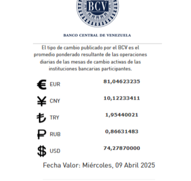 El Banco Central de Venezuela (BCV), fijó la tasa del dólar oficial que estará vigente para el miércoles 09 de abril. La tendencia de la moneda estadounidense sigue con tendencia elevada.