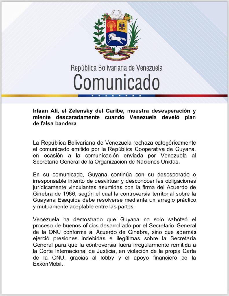 Venezuela repudió de manera contundente el comunicado emitido por la República Cooperativa de Guyana, en el cual negó falsamente su participación para planificar una operación de «falsa bandera» contra la nación venezolana.