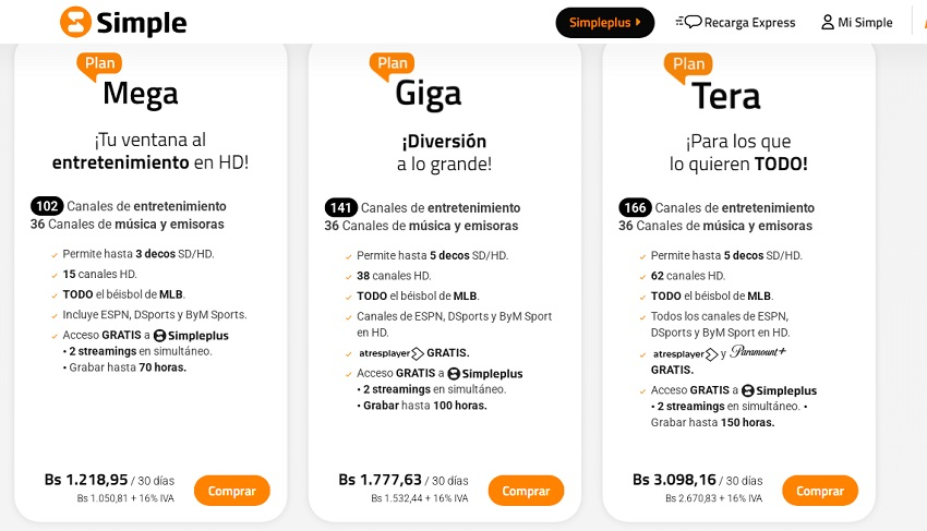 Del mismo modo, el Plan Giga HD tiene un precio de Bs. 1.777,63, presentando un aumento del 25,49% en bolívares en comparación con abril. Tiene 177 canales, permite hasta cinco decodificadores adicionales, tiene 38 canales HD y acceso gratis a SimplePlus.