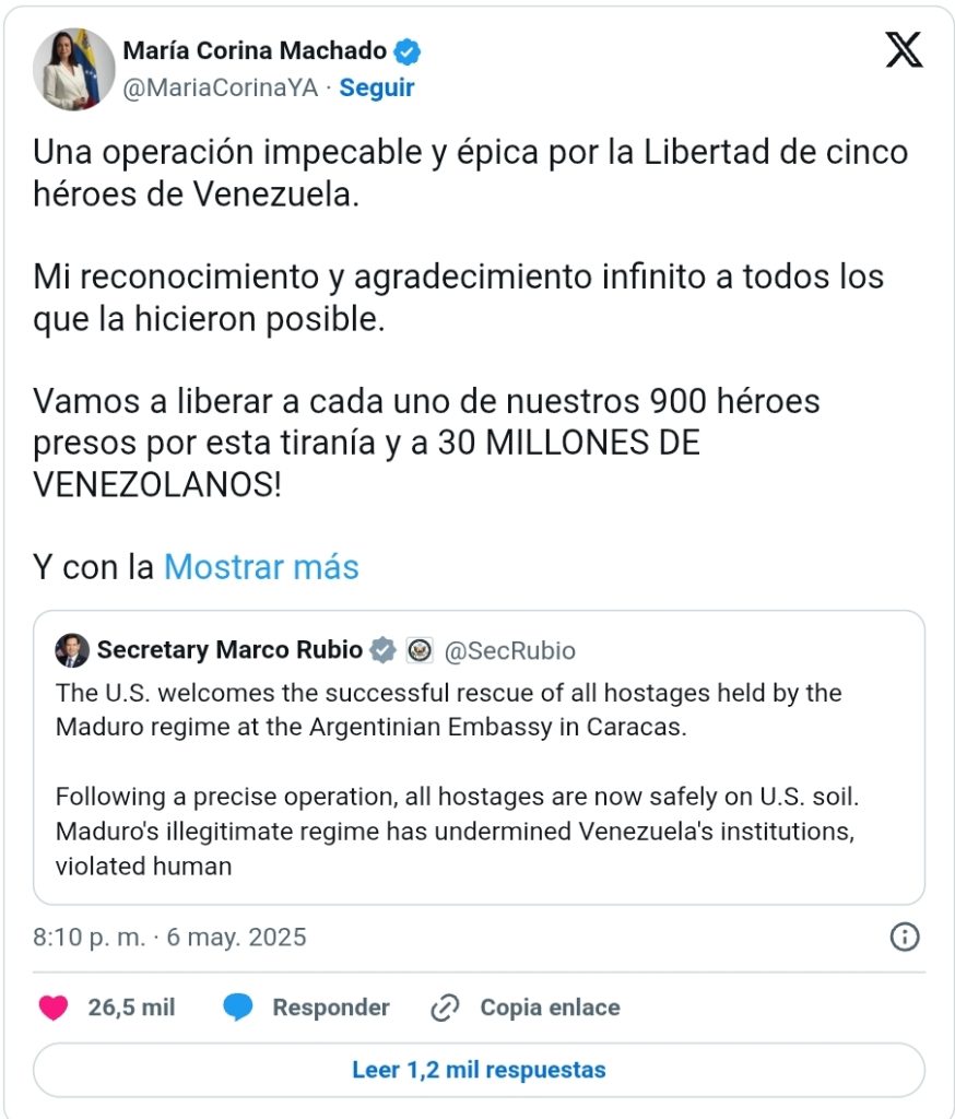 «Estados Unidos celebra el exitoso rescate de todos los rehenes retenidos por el régimen de Maduro en la Embajada de Argentina en Caracas», expresó en su cuenta de X.
