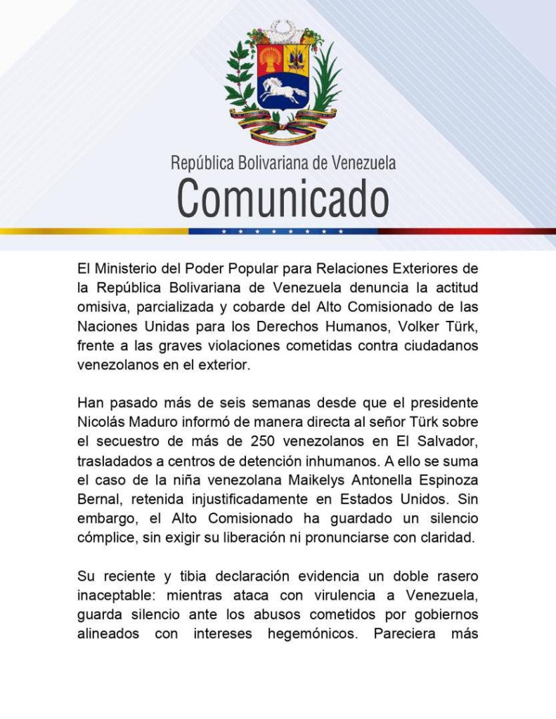 El Ministerio del Poder Popular para Relaciones Exteriores de la República Bolivariana de Venezuela emitió un comunicado este martes para denunciar una “actitud omisiva, parcializada y cobarde” por parte del Alto Comisionado de las Naciones Unidas para los Derechos Humanos, Volker Türk, frente a “las graves violaciones cometidas” contra ciudadanos venezolanos en el exterior.