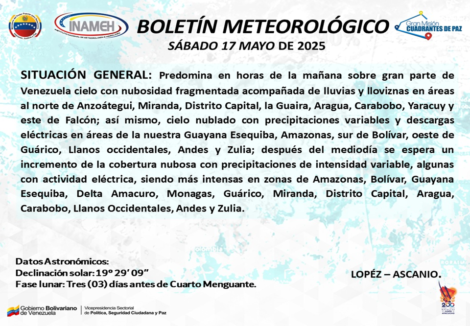 El Instituto Nacional de Meteorología e Hidrología (Inameh), reseño en su boletín informativo, que este sábado 17 de mayo predomina en horas de la mañana sobre gran parte de Venezuela cielo con nubosidad fragmentada acompañada de lluvias y lloviznas en áreas al norte de Anzoátegui, Miranda, Distrito Capital, la Guaira, Aragua, Carabobo, Yaracuy y el este de Falcón.