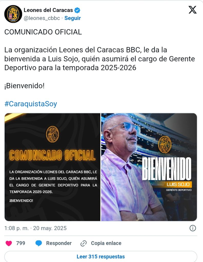“La organización Leones del Caracas BBC, le da la bienvenida a Luis Sojo, quién asumirá el cargo de gerente deportivo para la temporada 2025-2026 ¡Bienvenido!”, dice la misiva.