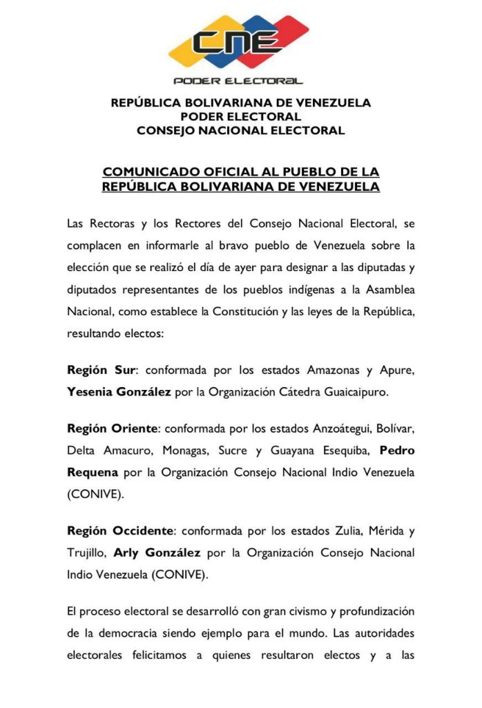 El Consejo Nacional Electoral (CNE) dio a conocer los resultados de la jornada comicial realizada el 1 de junio para la escogencia de diputadas y diputados indígenas a la Asamblea Nacional (AN), de acuerdo con lo establecido en la Constitución y las leyes de la República.