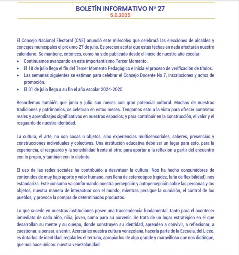 Este jueves el Ministro de Educación, Héctor Rodríguez anunció mediante el Boletín Informativo Nº 27, aspectos informativos de relevancia, para los actos de promoción.