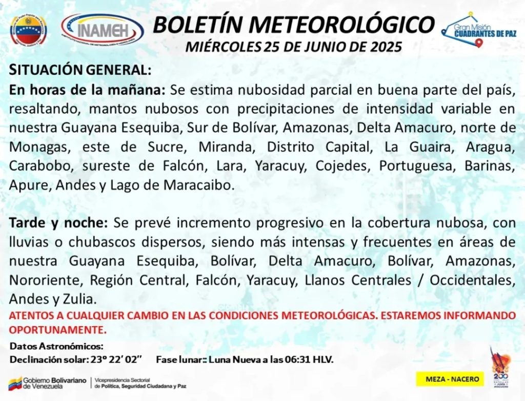 El organismo señala que las entidades más vulnerables son el Esequibo, Amazonas, Bolívar, norte de Delta Amacuro, Anzoátegui, suroeste de Sucre, Guárico, Gran Caracas, Aragua, Carabobo, Yaracuy, Apure, Barinas, Portuguesa, Falcón, Lara, Mérida, Táchira, Trujillo y Zulia.