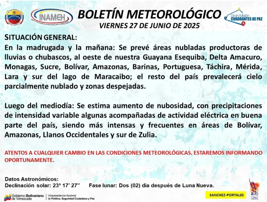 El Instituto Nacional de Meteorología e Hidrología (Inameh) prevé para este viernes 27 de junio, áreas nubladas productoras de lluvias, al oeste de Guayana Esequiba, Delta Amacuro, Monagas, Sucre, Bolívar, Amazonas, Barinas, Portuguesa, Táchira, Mérida, Lara y sur del lago de Maracaibo; el resto del país prevalecerá cielo parcialmente nublado y zonas despejadas.