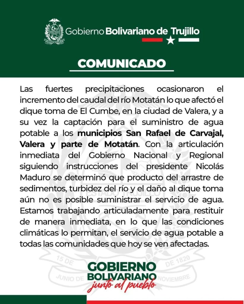 «Tenemos máquinas pesadas abriendo trochas porque la vía, en seis sectores, se lo llevó la crecida del río Motatán. Estas son las aguas que vienen del páramo (…) y las aguas y crecidas del río han afectado un grupo de viviendas, cuyos habitantes están en refugios (…) hay sectores que el agua se lo llevó por completo», advirtió.