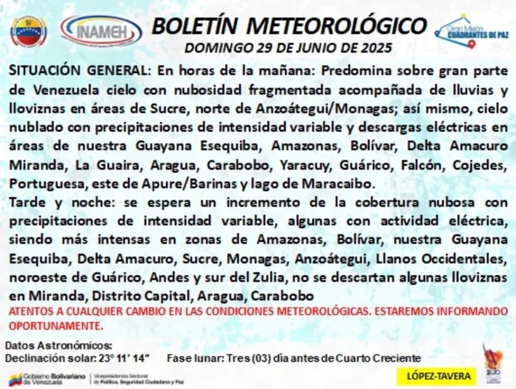 De igual forma, indica que habrá cielo nublado con precipitaciones de intensidad variable y descargas eléctricas ocasionales en zonas del Esequibo, Amazonas, Bolívar, Delta Amacuro, Miranda, La Guaira, Carabobo, Yaracuy, Guárico, Falcón, Cojedes, Portuguesa, este de Apure y Barinas; junto al Lago de Maracaibo.