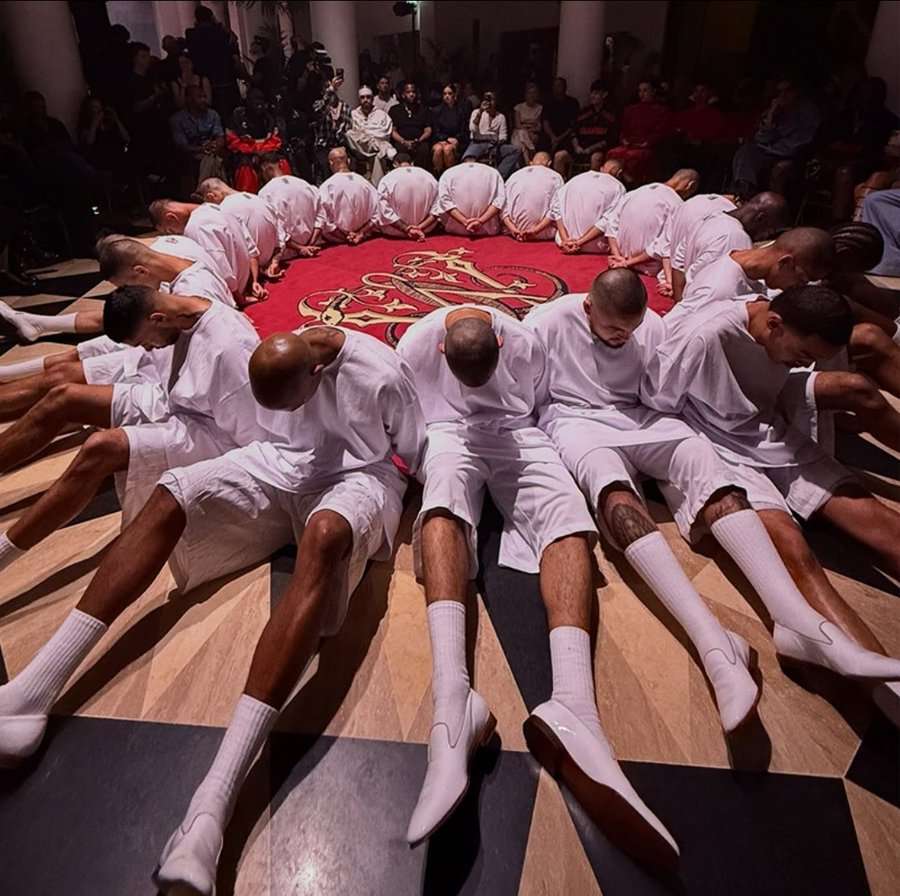 Sobre la pasarela, los modelos lucieron prendas completamente blancas y realizaron un emotivo acto de arrodillarse, simbolizando a los 252 migrantes venezolanos que, tras ser deportados de Estados Unidos, habrían sido trasladados al Cecot, donde llevan más de 100 días retenidos. Además, la colección rindió homenaje a las personas migrantes detenidas por el Servicio de Inmigración y Control de Aduanas (ICE) en Estados Unidos.