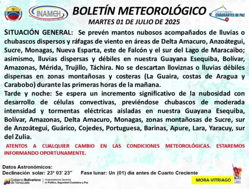 Se prevén mantos nubosos acompañados de lluvias o chubascos dispersos y ráfagas de viento en áreas de Delta Amacuro, Anzoátegui, Sucre, Monagas, Nueva Esparta, este de Falcón y el sur del Lago de Maracaibo; asimismo, lluvias dispersas y débiles en el Esequibo, Bolívar, Amazonas, Mérida, Trujillo, Táchira.