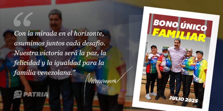 A partir de este miércoles 2 de julio hasta el 8, el Gobierno nacional estará entregando el pago del «Bono Único Familiar», correspondiente al mes en curso y establecido por el ejecutivo nacional, a través del Sistema Patria.