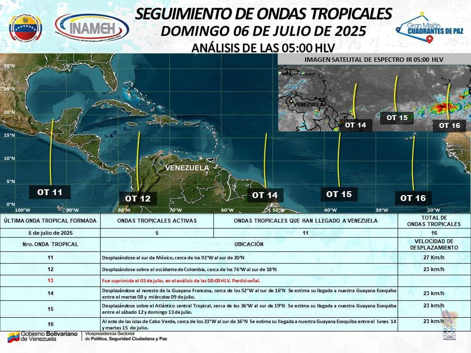 Adicionalmente, el organismo detalló el avance de al menos tres ondas tropicales (OT) que se aproximan al territorio nacional. Se prevé que la primera de estas ondas llegue entre el martes 8 y el miércoles 9 de julio, seguida de otras dos que bordearán Venezuela en los días subsiguientes.