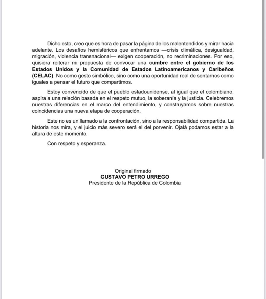 «En aras del diálogo, quiero decir que mi intención no es cerrar puertas, sino abrir caminos para una conversación honesta y respetuosa entre nuestros países», añadió Petro en la misiva.