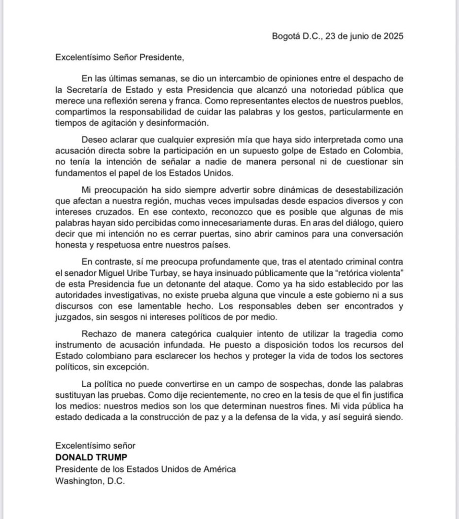«En las últimas semanas, se dio un intercambio de opiniones entre el despacho de la Secretaría de Estado y esta Presidencia, que alcanzó una notoriedad pública que merece una reflexión serena y franca», se lee en la carta. Petro aclaró que cualquier expresión suya que haya sido interpretada como una acusación directa sobre la participación en un supuesto golpe de Estado «no tenía la intención de señalar a nadie de la era personal ni de cuestionar sin fundamentos el papel de los EE.UU.».
