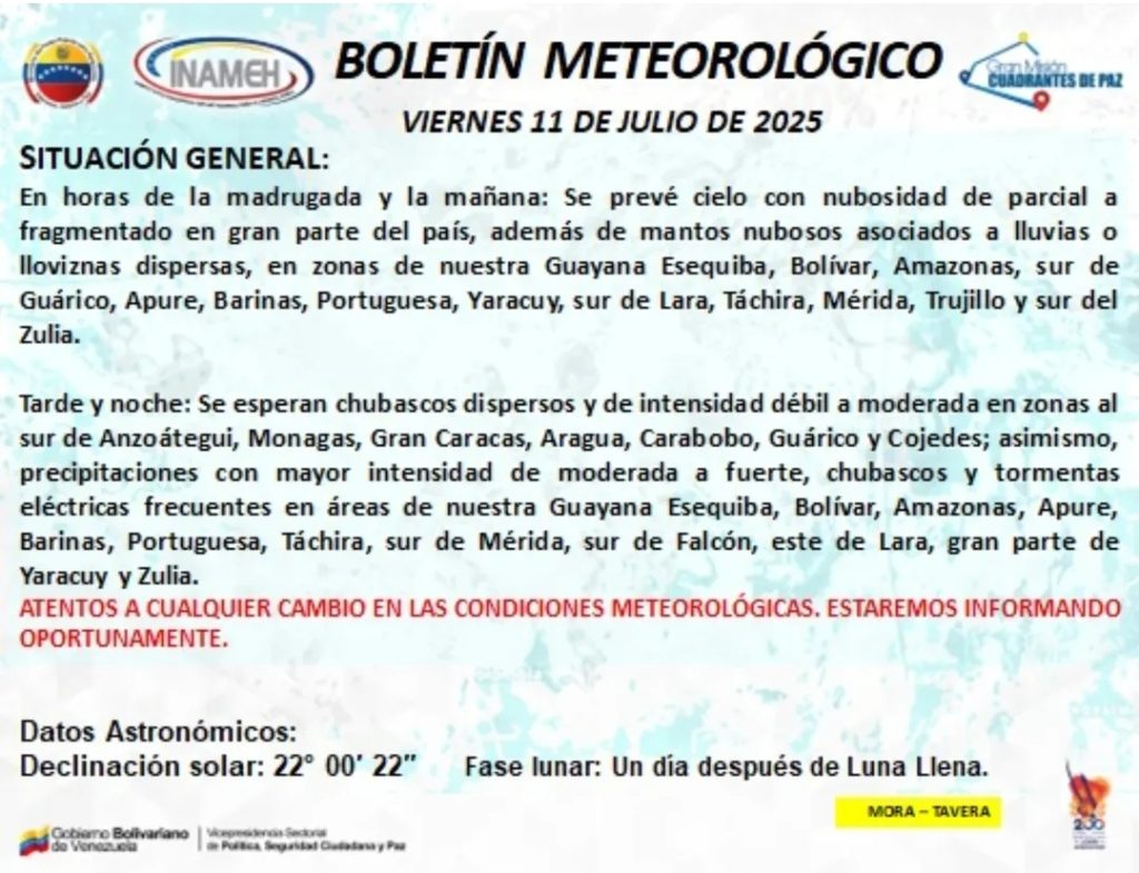 Después del mediodía, se esperan chubascos dispersos, que pueden pasar de baja a moderada intensidad, en áreas de Anzoátegui, Monagas, Gran Caracas, Aragua, Carabobo, Guárico y Cojedes. Además, se pronostican precipitaciones que pasarán de moderada a fuerte intensidad, junto a chubascos y tormentas eléctricas en partes del Esequibo, Bolívar, Amazonas, Apure, Barinas, Portuguesa, sur de Mérida y Falcón; este de Lara y gran parte de Zulia y Yaracuy.