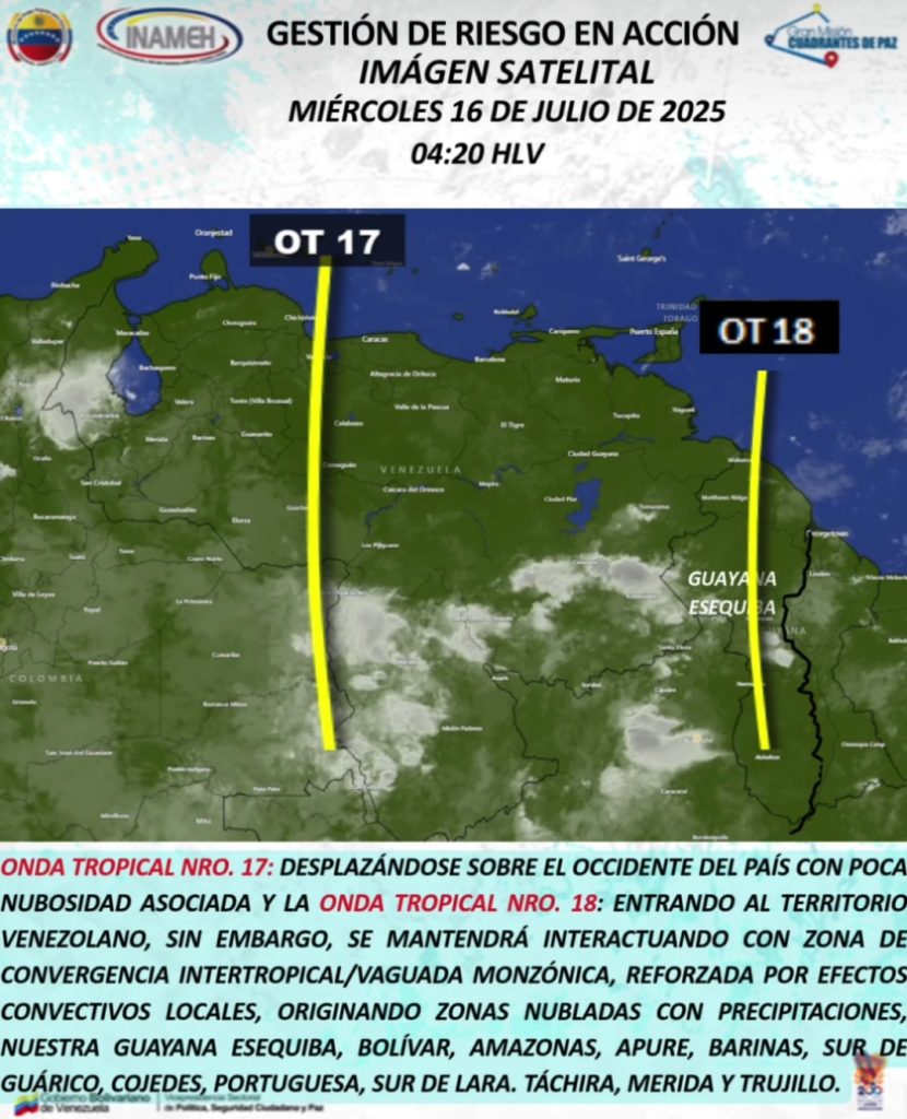 Se prevé qué durante la mañana habrá previsiones de un cielo parcialmente nublado con algunas zonas despejadas en gran parte del territorio nacional; aunque espera que se formen mantos nubosos que estén acompañados de lluvias o chubascos dispersos que afectan zonas en el Esequibo, Bolívar, Amazonas, Apure, Barinas, Táchira, Mérida, Trujillo y Zulia.