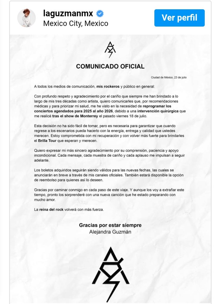 La cantante Alejandra Guzmán anunció este jueves la cancelación de todos los conciertos programados para 2025, como parte de su gira «Brilla Tour», luego de someterse a una cirugía de emergencia tras su presentación del 18 de julio en Monterrey.