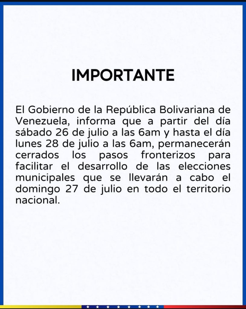 Venezuela anunció que sus pasos fronterizos estarán cerrados a partir de las 06.00 A.M. de este sábado y durante 48 horas por las elecciones de alcaldes y de concejos municipales de este domingo 27 de julio.