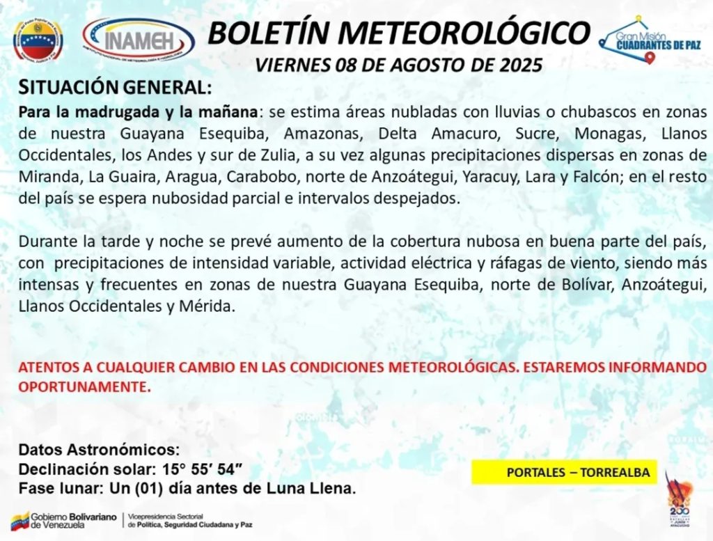 Durante la mañana, el Inameh señaló que hay estimaciones de áreas nubladas generadoras de lluvias y chubascos que afectarán al Esequibo, Amazonas, Delta Amacuro, Sucre, Llanos Occidentales, los Andes y sur del Zulia.